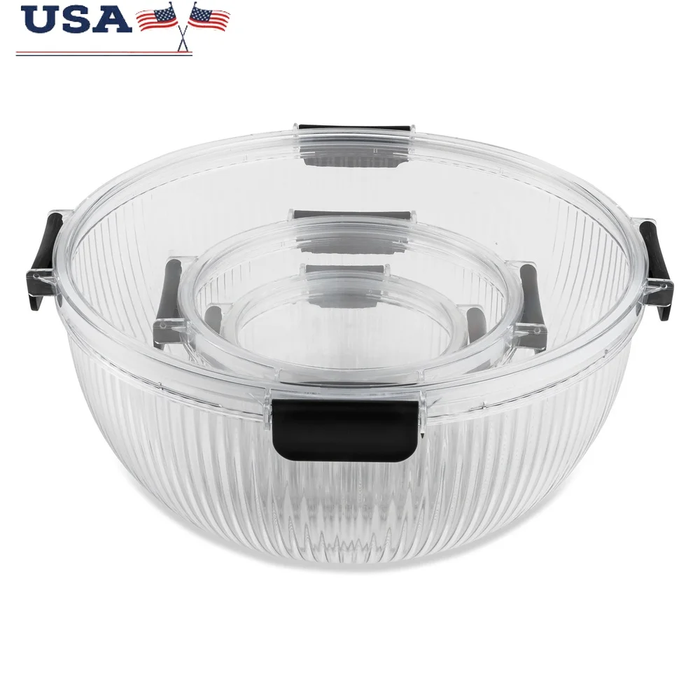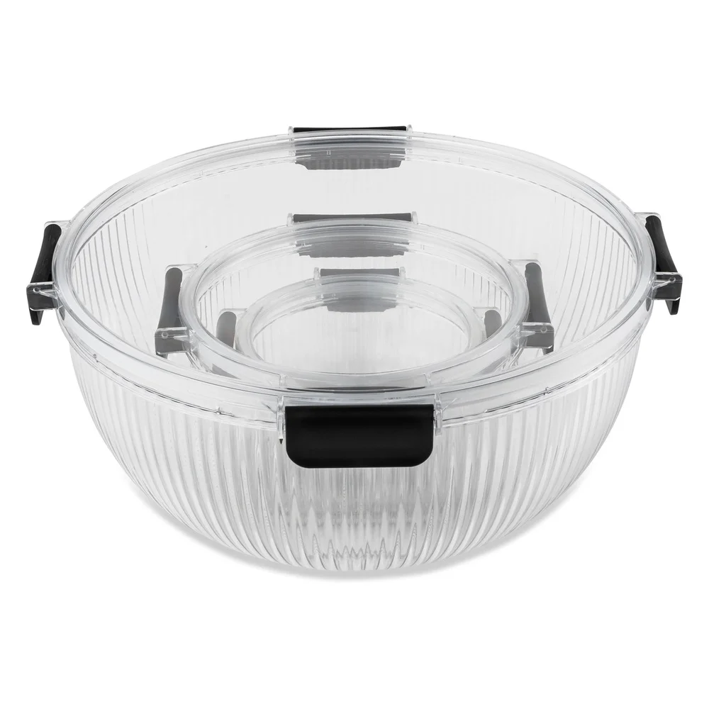 Includes a 4. 4-liter, 1. 2-liter, and 420 mL bowl. Each is crafted from durable, food-safe material with a modern ribbed texture. The clear design and snap-lock lids keep food fresh and blend seamlessly with any décor. Bowls nest together for compact storage. Offers style and functionality for all your food prep and storage needs.